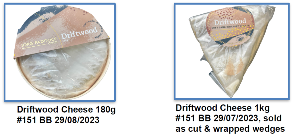 Cheese Full Circle Pty Ltd (trading as Long Paddock Cheese & The Cheese School) is conducting a recall of Driftwood Cheese 180g and 1 kg. The products have been available for sale at independent food retailers in NSW and VIC and IGA Macedon in Vic.